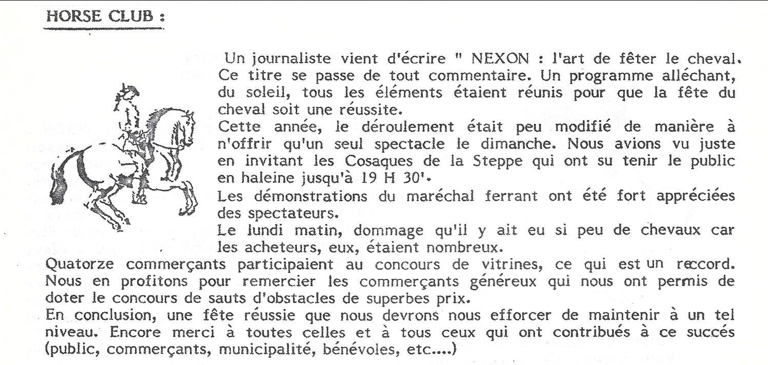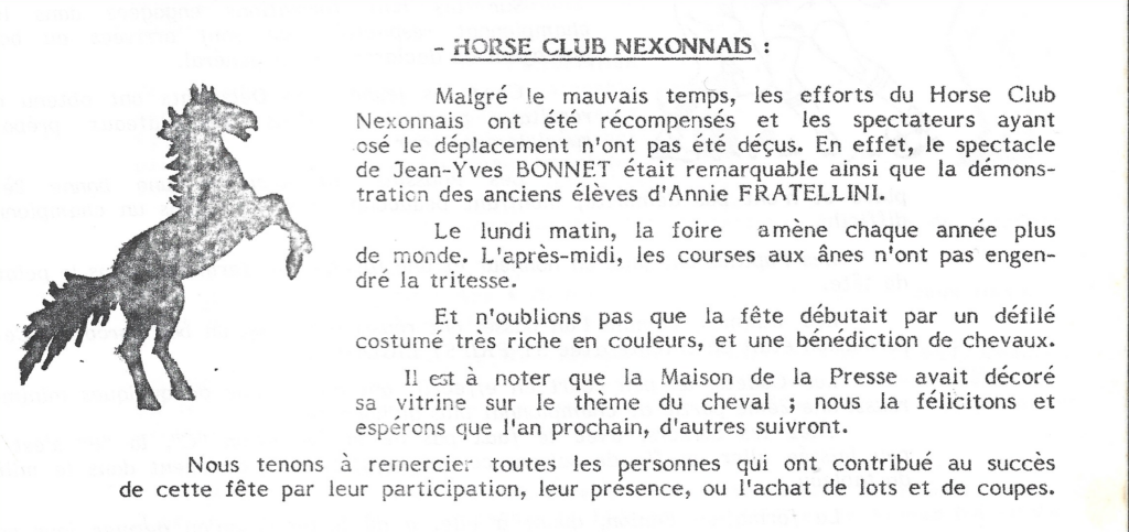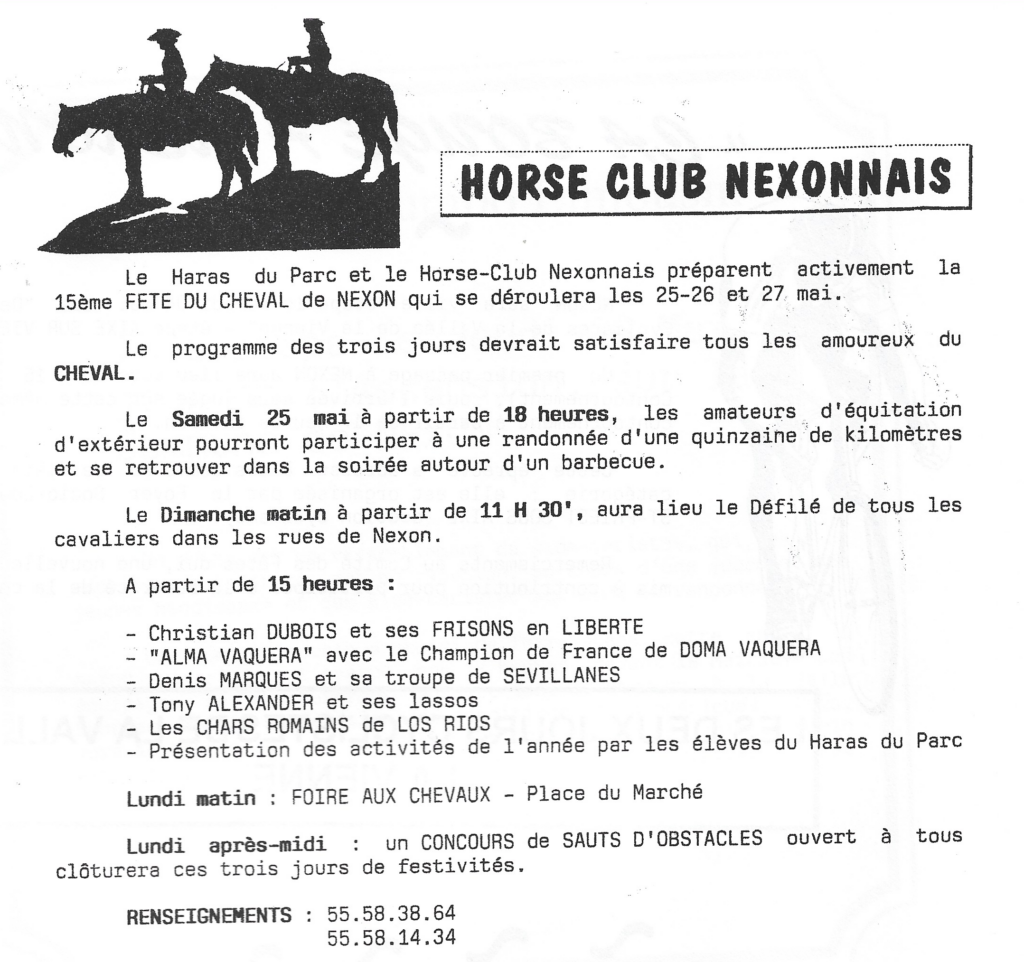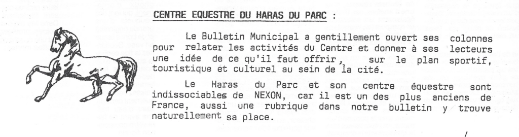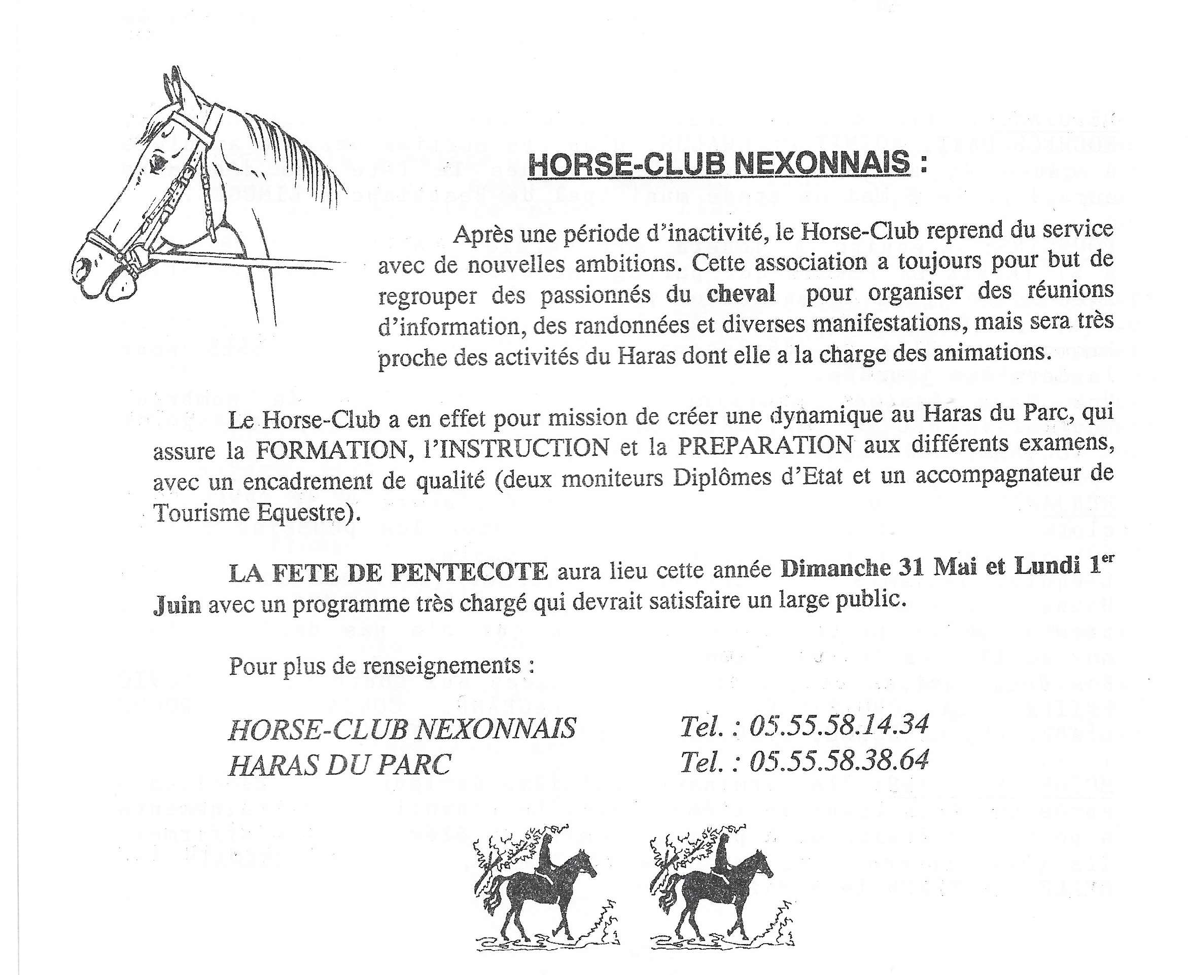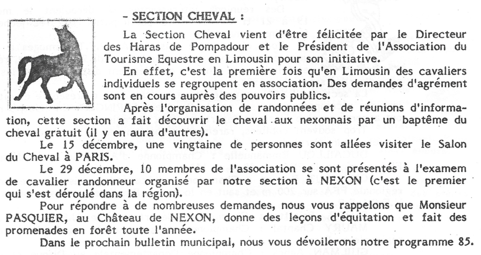 Au début de l’année 1984, afin d’inciter les jeunes à pratiquer l’équitation l’Amicale de la Jeunesse Nexonnaise (AJN) crée une section cheval. Le succès suit et le Bulletin municipal de juin 1984 en rend compte :