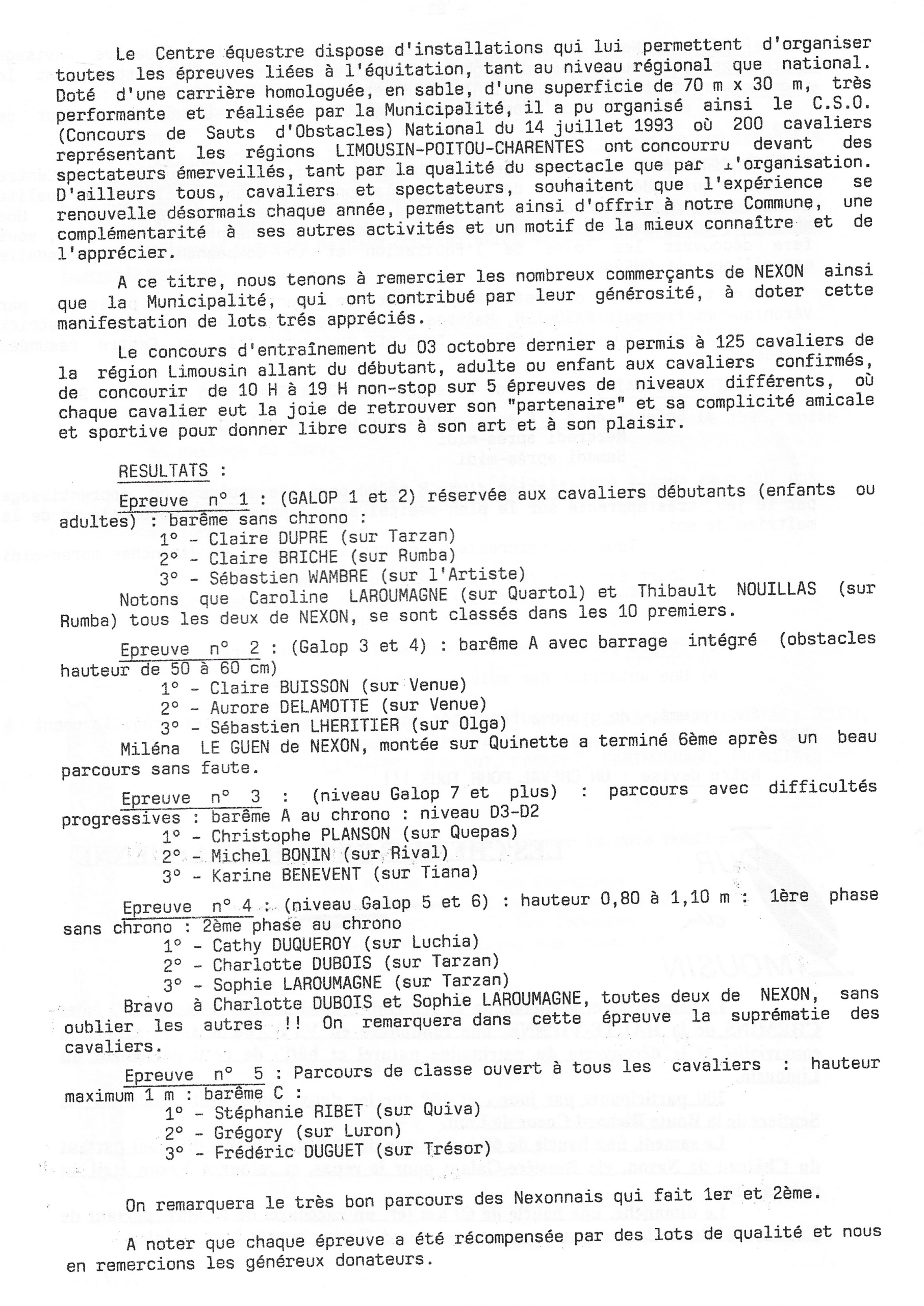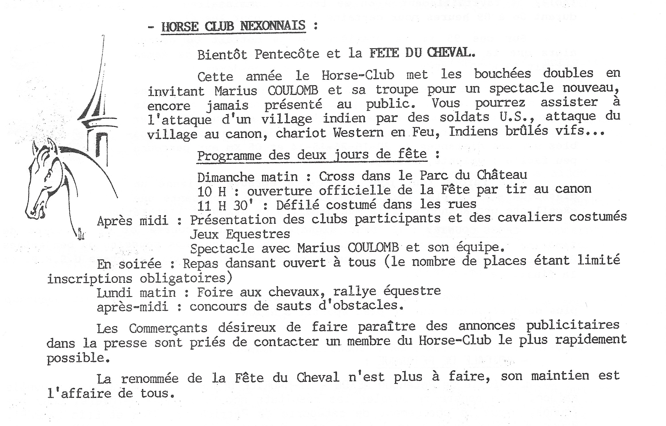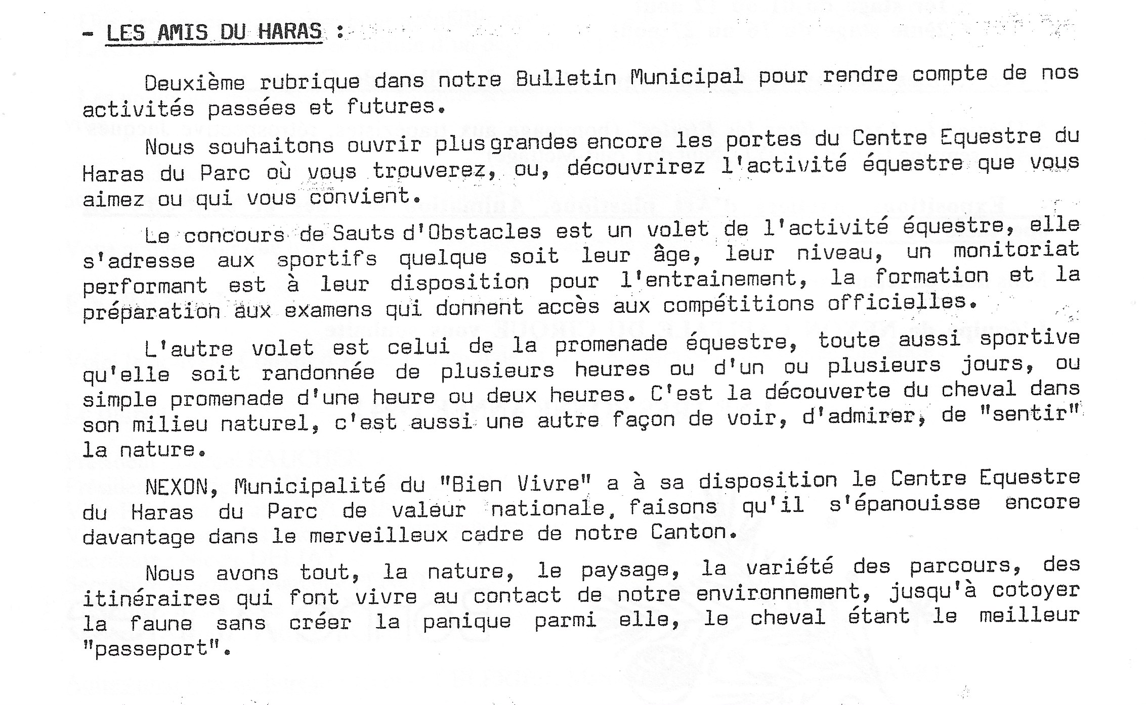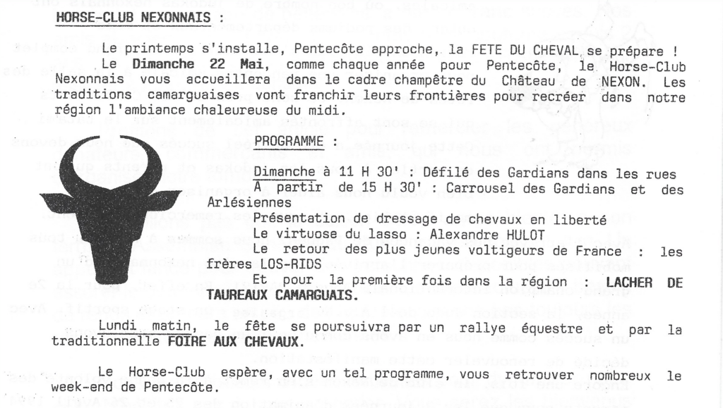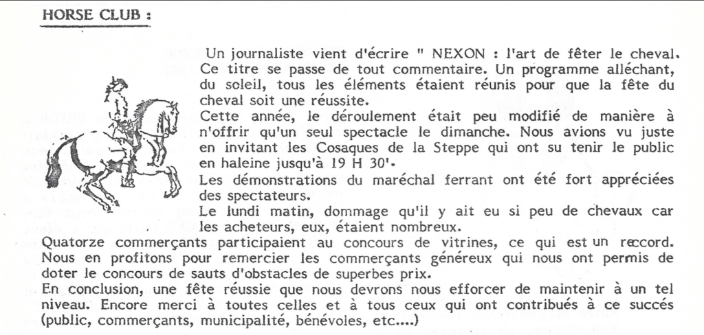 Au début de l’année 1984, afin d’inciter les jeunes à pratiquer l’équitation l’Amicale de la Jeunesse Nexonnaise (AJN) crée une section cheval. Le succès suit et le Bulletin municipal de juin 1984 en rend compte :