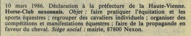 Le 10 mars 1986 les statuts de la nouvelle association, Le Horse club nexonnais, sont déposés à la préfecture.