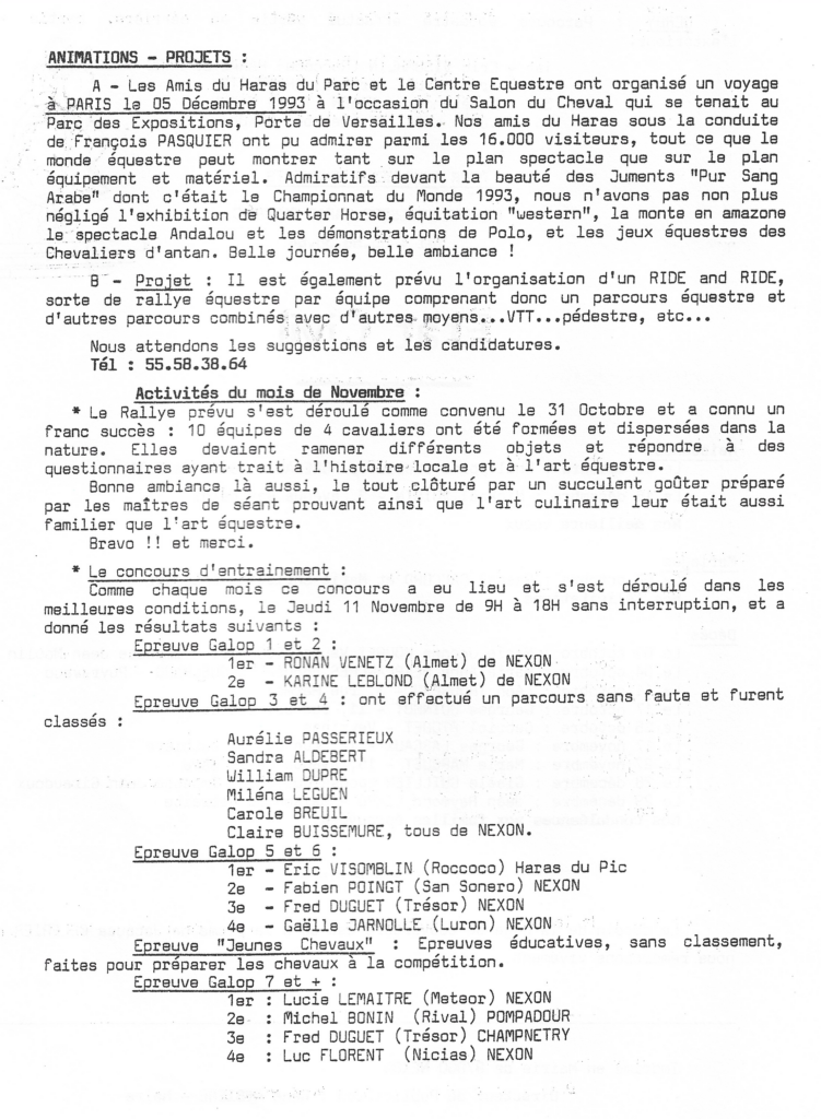 En décembre 1988 l’Assemblée générale tire un bilan positif de l’année avec plusieurs cavaliers qui ont été reçus aux examens qu’ils ont passés. En parallèle du Horse -Club l’Association des Amis du Parc participe à l’animation du parc et a organisé un diner réunissant 80 convives.