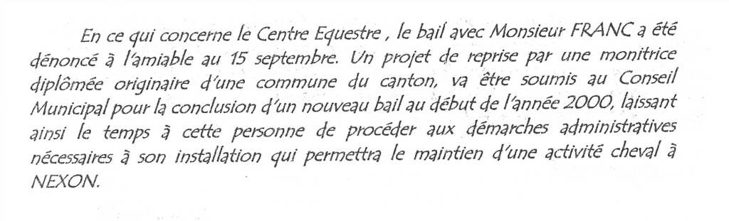 La Commune signe un bail rural et un bail pour la carrière avec Jean Luc FRANC. Mais il n’y a plus de leçons d’équitation. Pourtant en 1998 le Horse Club annonce que la Fête du Cheval aura bien lieu le 31 mai 1998.