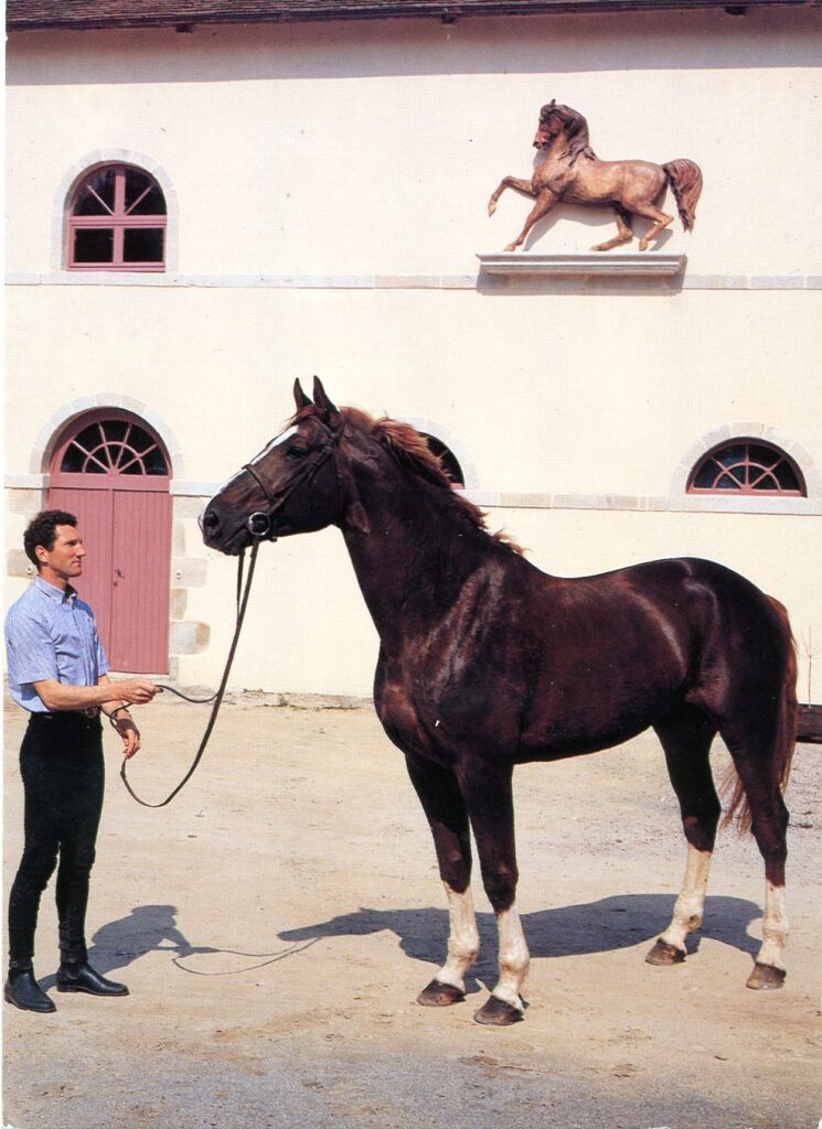 S’il s’oriente de plus en plus vers une équitation plus fluide françois PASQUIER est toujours fier de Quartalpha ainsi qu’il le présente devant les écuries du château en mars 1991.